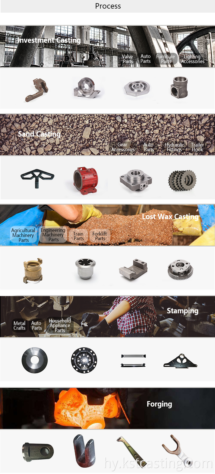 Օդային գարնանային աջակցություն ավտոմեքենաների մասերի, կոճղի կեռիկ եւ այլն); Փական ձուլում, փականի կցամասեր, գյուղատնտեսական տեխնիկայի մասեր, պոմպեր եւ այլն: